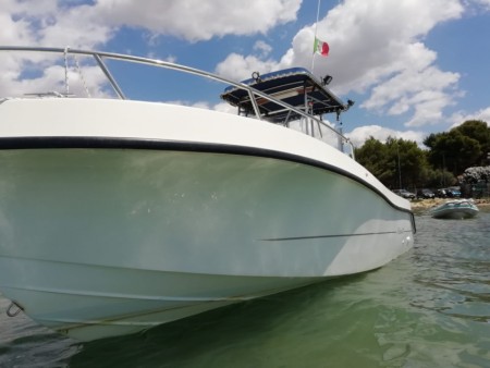 COMODA E SPORTIVA IMBARCAZIOELNE PER CROCIERA GIORNALIERA NELLO SPLENDIDO MARE DEL SALENTO!!! In compagnia di un simpaticissimo capitano che metterà a vostra disposizione la sua professionalità e gentilezza, Dopo essere salpati da Porto Cesareo, la prima tappa con sosta bagno sarà la piscina naturale di punta prosciutto LOCATION TOP molto esclusiva con mare caraibico ed acque termali cristalline, Successivamente si virerà verso Torre Lapillo con vista mozzafiato delle Torri costiere di avvistamento volute da Carlo V per proteggere il Salento dalle invasioni dei Saraceni, Da lì faremo rotta verso i monumenti marittimi sottomarini con soste bagno: Le meravigliose colonne greco/romane a Porto Cesareo E La madonna affondata dei naviganti a Torre Lapillo, A seguito di un emozionante virata attorno alle isole costiere eseguiremo un attracco con visita guidata presso l'isola dei conigli (o isola grande) dove vi sarà offerto un indimenticabile aperitivo a base di specialità salentine biologiche e una selezione di vini locali!!! Disponibilità di coca Cola e succhi di frutta per i più piccoli(offerti da noi) SARETE SOLTANTO VOI ED IL CAPITANO, MASSIMA PRIVACY E ZERO ASSEMBRAMENTI -ATTREZZATURA DA SNORKELING INCLUSA -APERITIVO ALCOLICO ED ANALCOLICO INCLUSO -SKIPPER E MARINAIO INCLUSI L'imbarcazione può essere noleggiata: Mattina dalle 9 alle 13 Pomeriggio dalle 15 alle 19 Serale dalle 19.30 alle 23.30