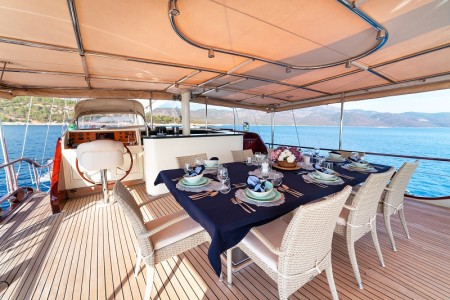 This wonderful deluxe gulet is 30 meters long and for 10 guests. It has 2 master cabin, 2 double cabin and 1 twin cabin . Each cabin has separate toilet, shower and A/C. We offer you reasonable prices and options for blue cruise. You can spend half of your holiday in the wonderful hidden paradise bays of aegean which are in Turkey. can spend rest of holiday in Greek Islands. Second option, you can prefer only Turkish bays or Greek islands. Each day 4 hours cruise and maximum 8 hours air condition. It is comfortable yacht for both options that you will be able to rent with the crew. CREW INFORMATION: CAPTAIN: He has been working as a captain since the long years in yachts. He is not only a professional captain but also he knows where the wonderful coasts, hidden paradise bays and historical ruins which are in Turkey very well. He will be happy to take you to the hidden paradise bays and inform about the historical ruins and culture there. CHEF COOK: Chef cook has been working too in the yachts for the long years . He/She is quite good at the traditional kitchen and Mediterranean kitchen. If you book this yacht, we will ask, if you will have a special request for he meals or not (Vegan, Gluten Free, Low Fat etc.). Our chef will get ready the food according to your requests. You can be sure that Chef will be happy welcoming you and to care about your wishes. Always, we have received good compliments by our guests about the meals. SAILOR: 2 Sailors will be at your service during your vacation. They are very friendly and will be happy to serve and to care of you . OUR SERVICES: we know that how important and valuable is your vacation. We will do our best to make your holiday the best and much more comfortable. Our professional guide is not only for briefing with you but also will be at your service during your vacation. He/She will be happy welcoming and caring you, introduce you to the crew, give briefing about the yacht, route and boat rules. Time to time, she/he is also going to be in touch with you to be sure that you are happy during your vacation. The best wishes for a wonderful holiday Included In The Prices : •All charter and berth tax, harbour and port procedures •Transit Log and related formalities •Mooring expenses •Crew service INCLUDED IN THE PRICE : All charter and berth tax, harbour and port procedures, Transit Log and related formalities, Mooring expenses, Crew service, Ship water, Diesel & Gasoline, Bed Linen & Bath towels, Use of equipment on board,Yacht insurance,VAT, NOT INCLUDED IN THE PRICE : Yacht Catering - Beverages, Harbour taxes and custom fees in foreign waters, Airport transfers, The use of Jet-ski and the water sports on board if exist.. Optional : Breakfast, Lunch, Dinner Daily pre person 45 Euro